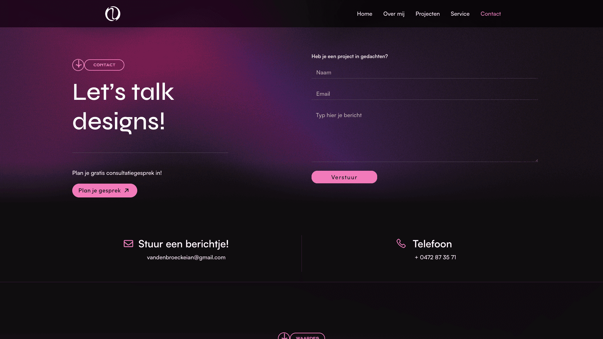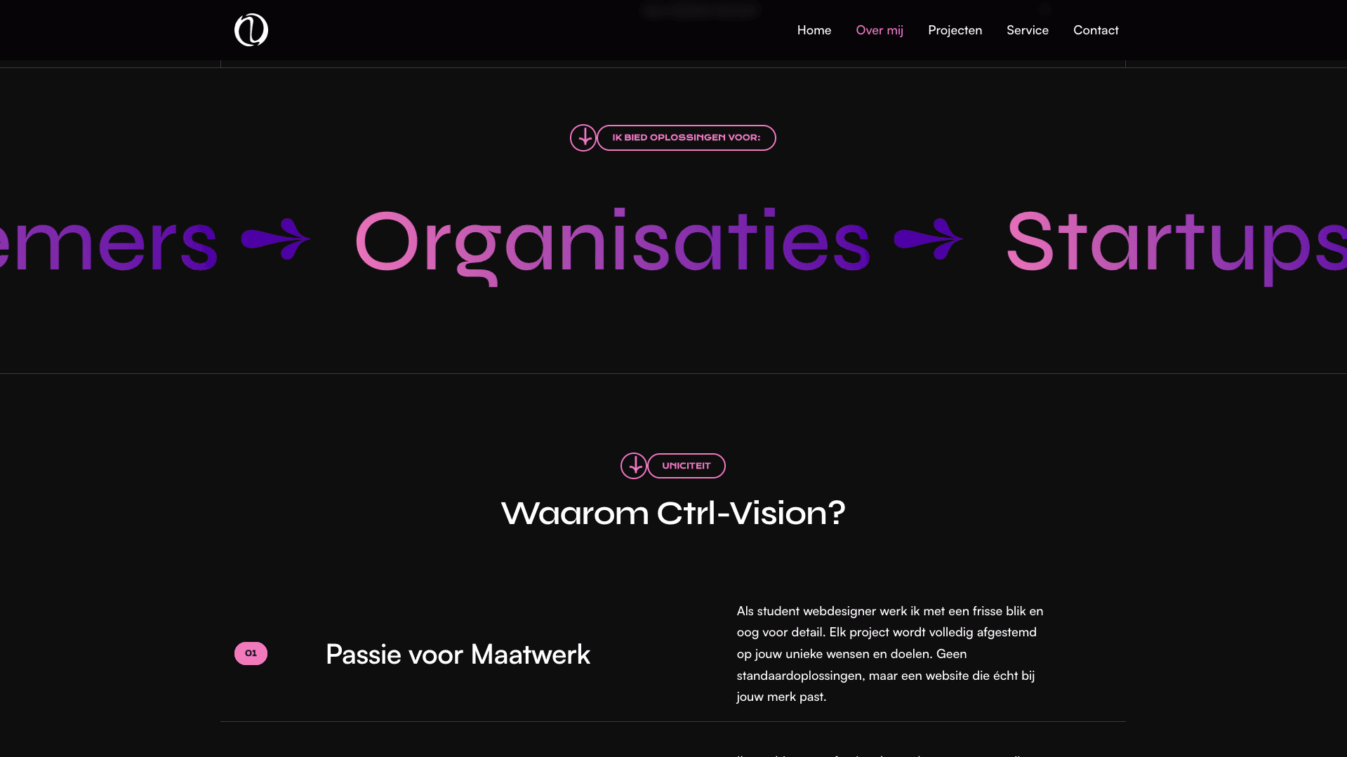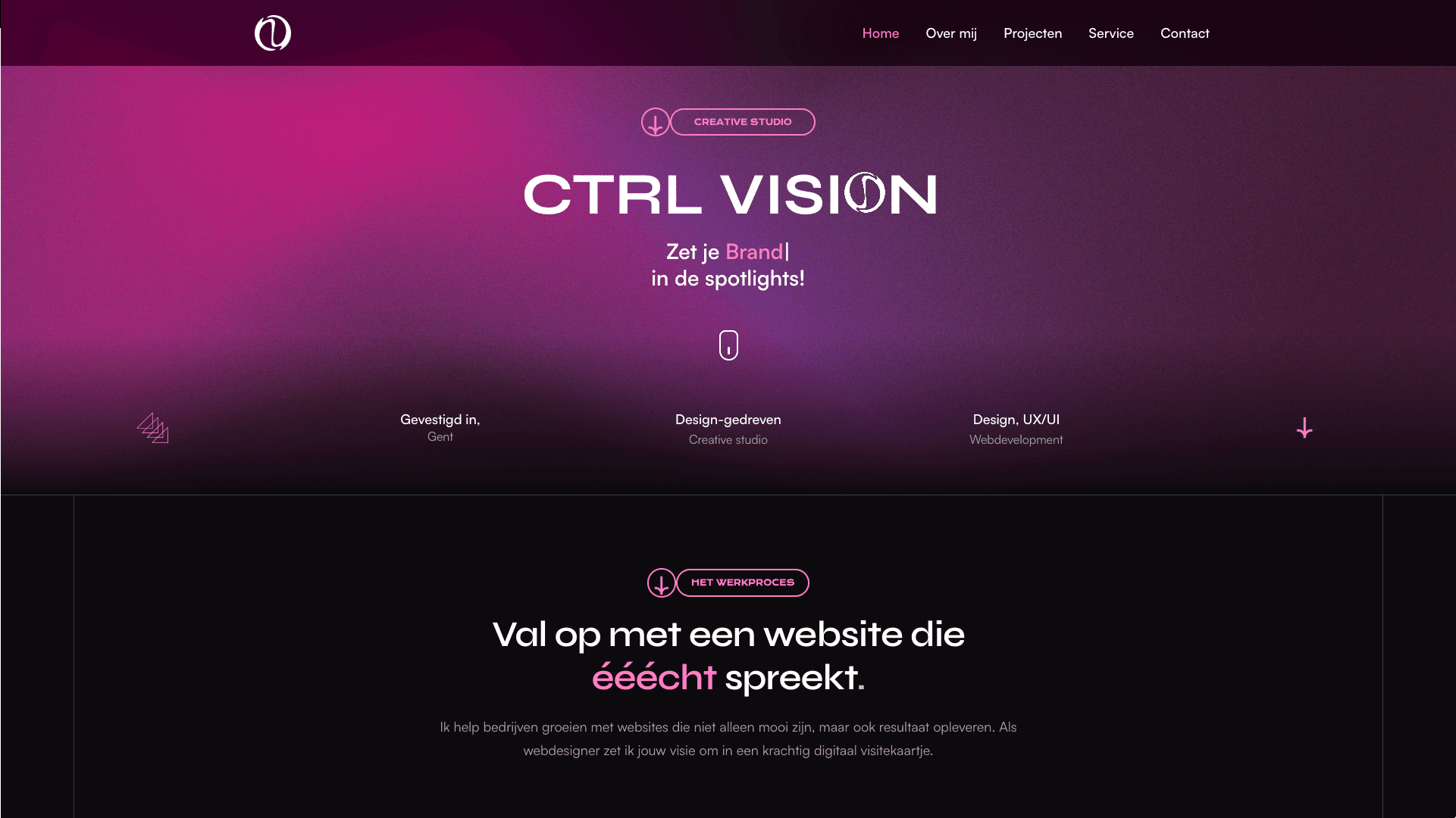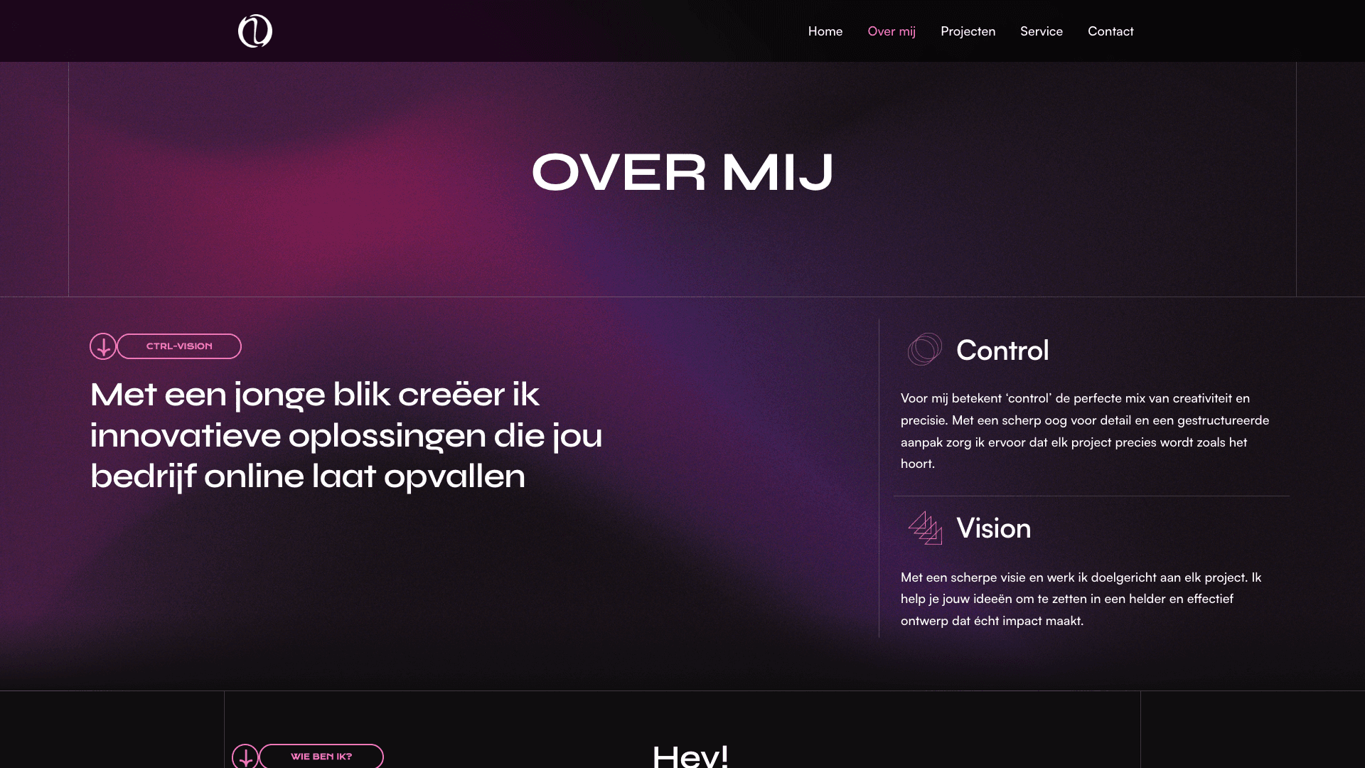 CTRL Vision is een website voor een creatieve maker met een uitgesproken visuele stijl. Opvallende typografie, subtiele beweging en krachtige kleuren zorgen voor een moderne en eigenzinnige uitstraling. Alles draait om karakter en beleving.